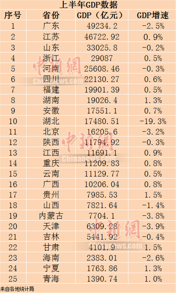 廣東上半年GDP為49234.20億元,同比下降2.5%;江蘇上半年GDP為46722.92億元,同比增長(zhǎng)0.9%;山東上半年GDP為33025.8億元,同比下降0.2%。